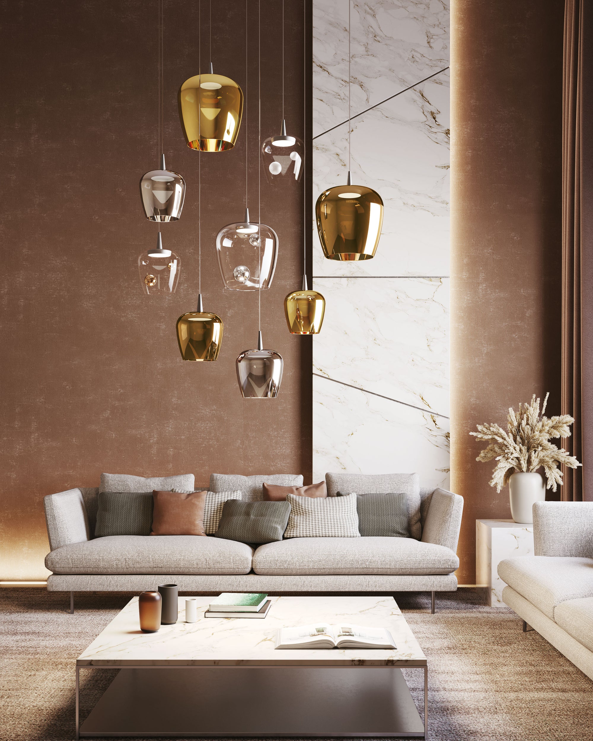 The bell-shaped design of the diffuser is inspired bythe colored glass tumbler collection of Zafferano Tableware. It is available in two sizes (diameter 18 and 27 cm) and in two models: essential, in four colors (transparent, silver, antique