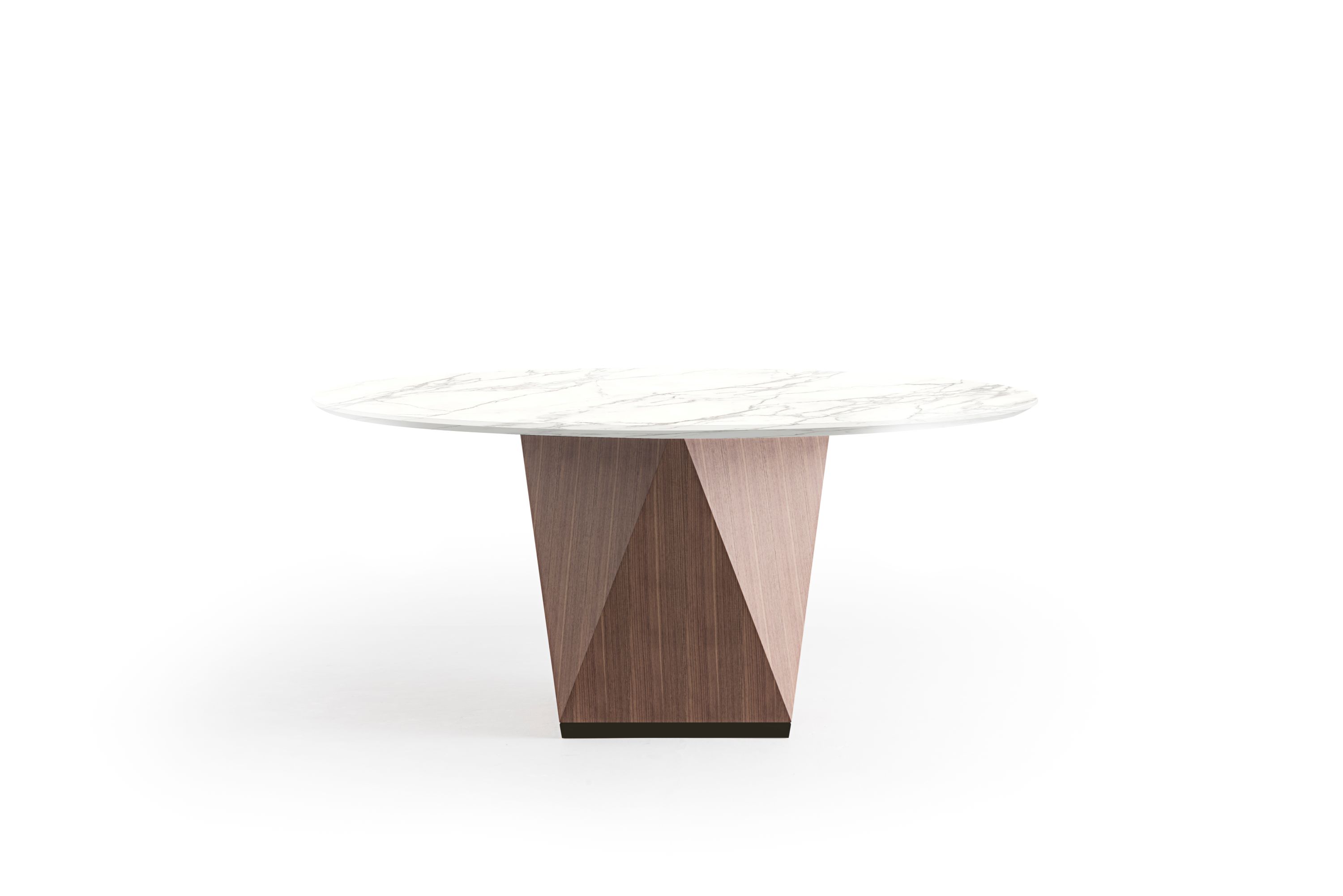 The primary intention of the PIANO COLLECTION by Nava + Arosio was to create sculptural elements basing on the processing of a flat sheet (hence the name “Piano” meaning “flat” in Italian), using the folding technique, to produce complex objects with high aesthetic impact and great elegance. The end result is a sculptural structure in which the series of different facets are underscored by the veins of the black walnut which bend with the actual shape, moulded around the clean lines of the corners and sloping planes. This structure, i.e. the central base of the dining table, is enhanced by the apparent lightness of the top in walnut or Calacatta marble, available in the round versions with diameter of 160 and 180 cm, for seating up to 10 people. The top also becomes a means of drawing attention to the base thanks to the apparent lightness of its perimeter. The concept of the table base underlies the collection of coffee and occasional tables as well, also embellished with the Calacatta marble top. This is in addition to the multitasking version in lacquer finish polyurethane which can be used as coffee table or become a practical stool with the fabric cushion as finishing touch. A sculptural yet, at the same time, lightweight collection, able therefore to create very original and impressive effects.