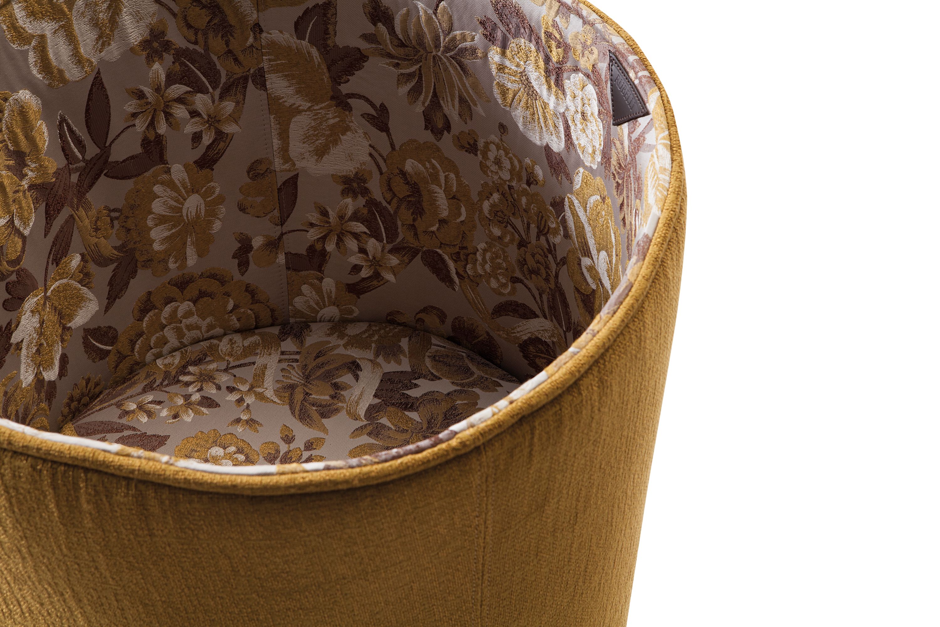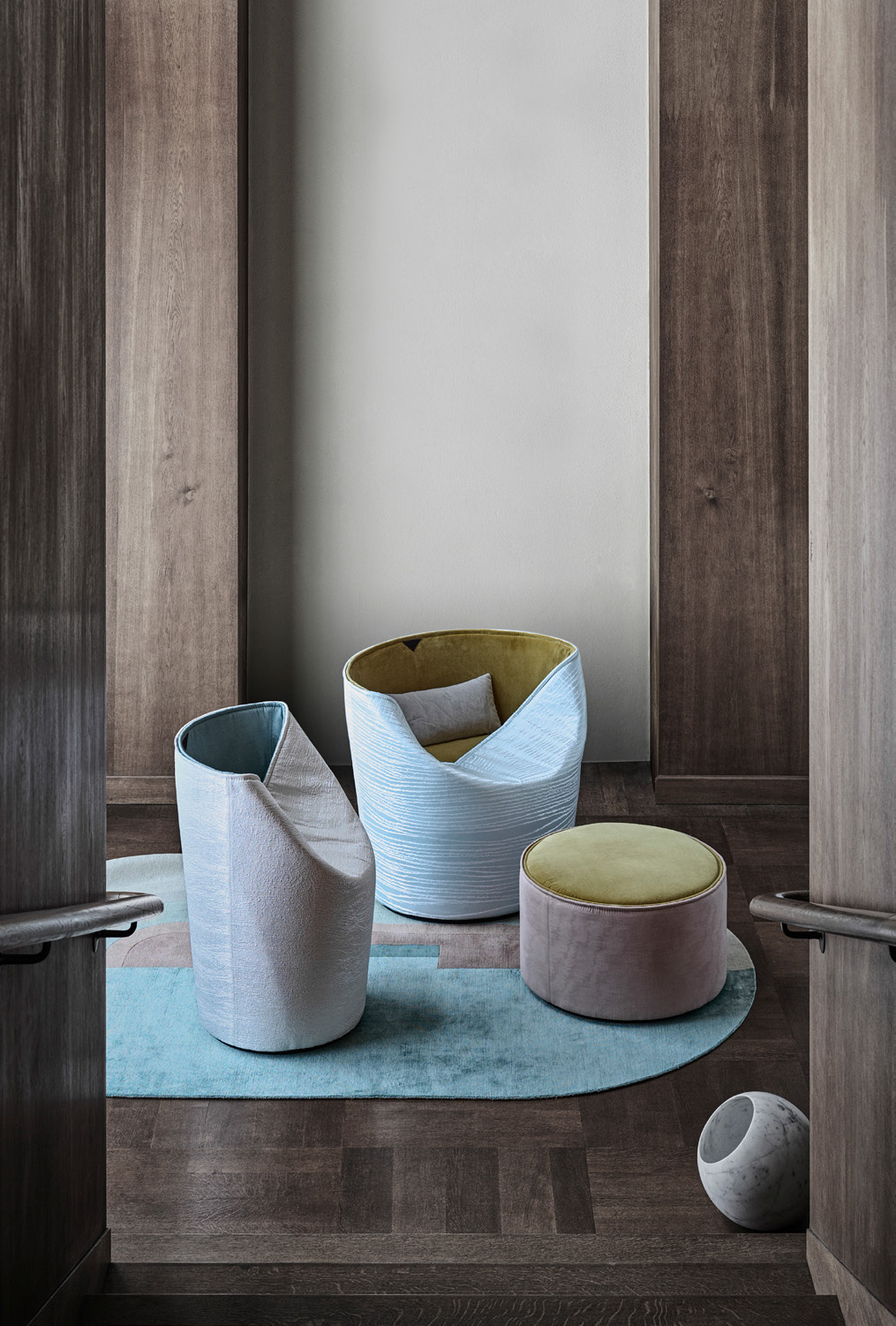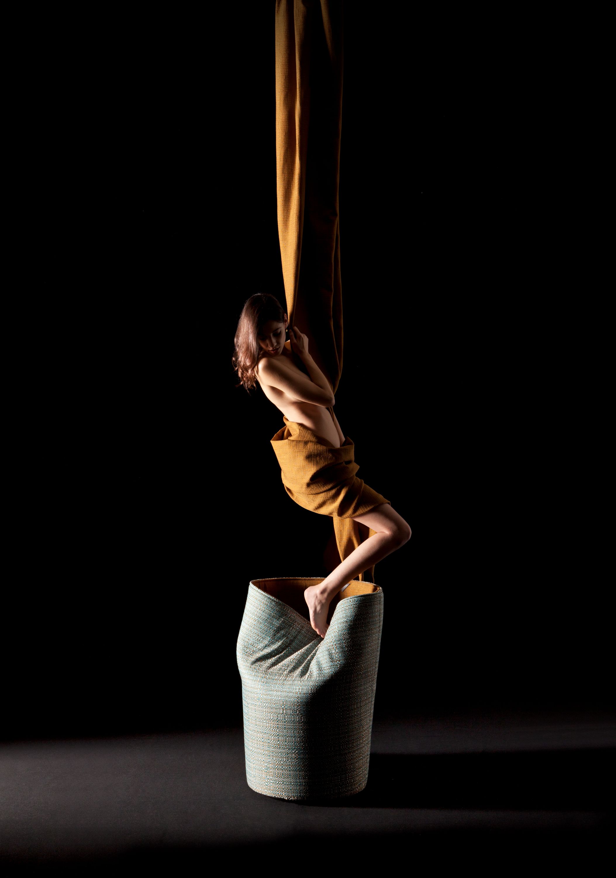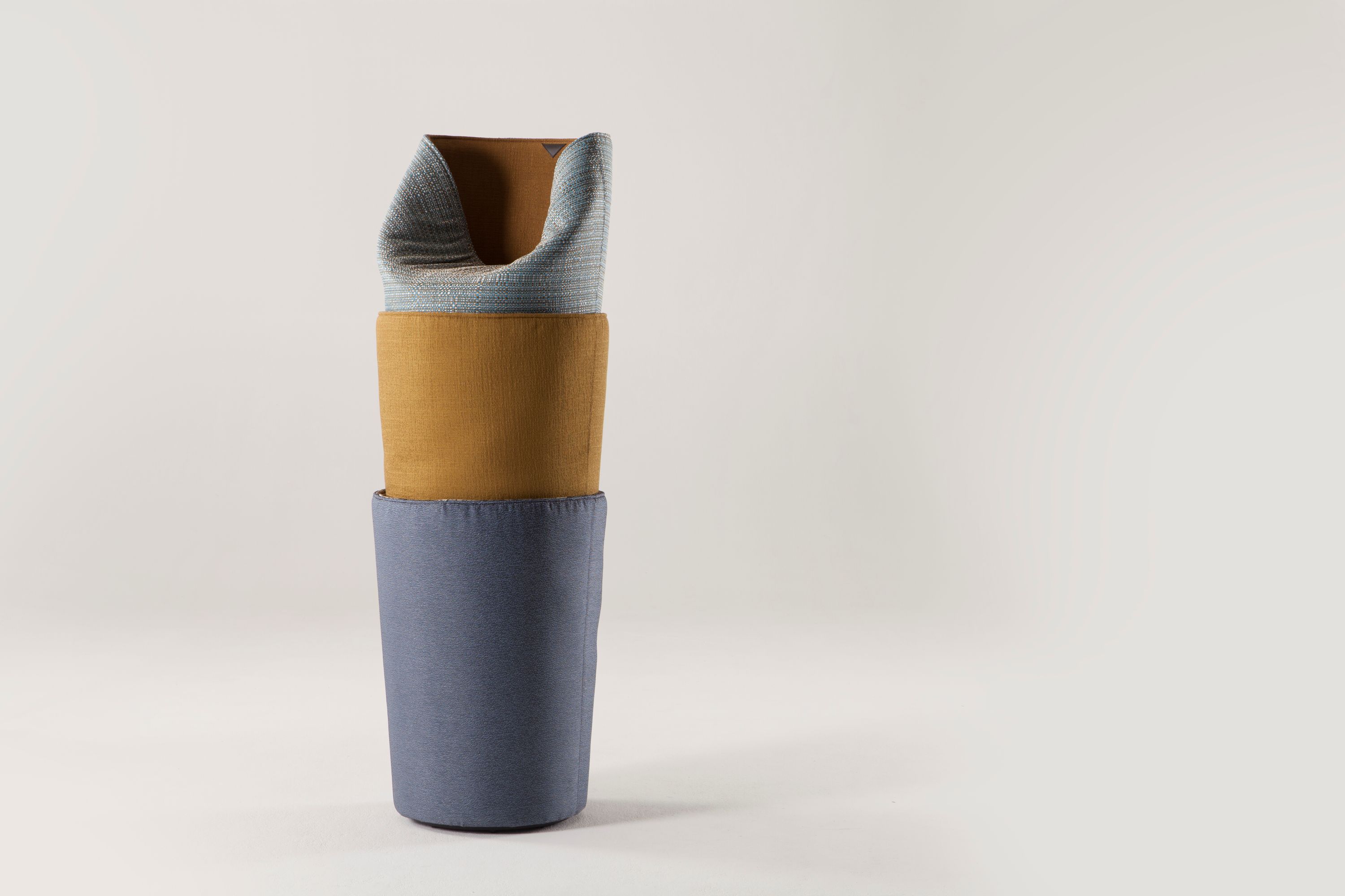 Pila-47 is a new seat and a new way of seating, where textile is the main feature. All textile, entirely handmade. Apparently unstructured, PILA-47 continuously changes its shape: when opened it is a pure geometric form, but when the proper side is lowered it becomes a comfortable chair. The structure is a seat in wood, provided with an upholstered "sleeve" made of reinforced wool felt. The wool gives structure to the back and at the same time allows it to return to its initial position: a movable chair. Pila-47 has no corner: all lines are curved and rounded, creating spaces, reflections and shadows that change continuously. Pila-47 is a green product, entirely made by hand using natural materials. It is fully upholstered: the only visible material is fabric, except a leather detail, embossed with the Rubelli logo, which both adds value to the chair and indicates the back side.